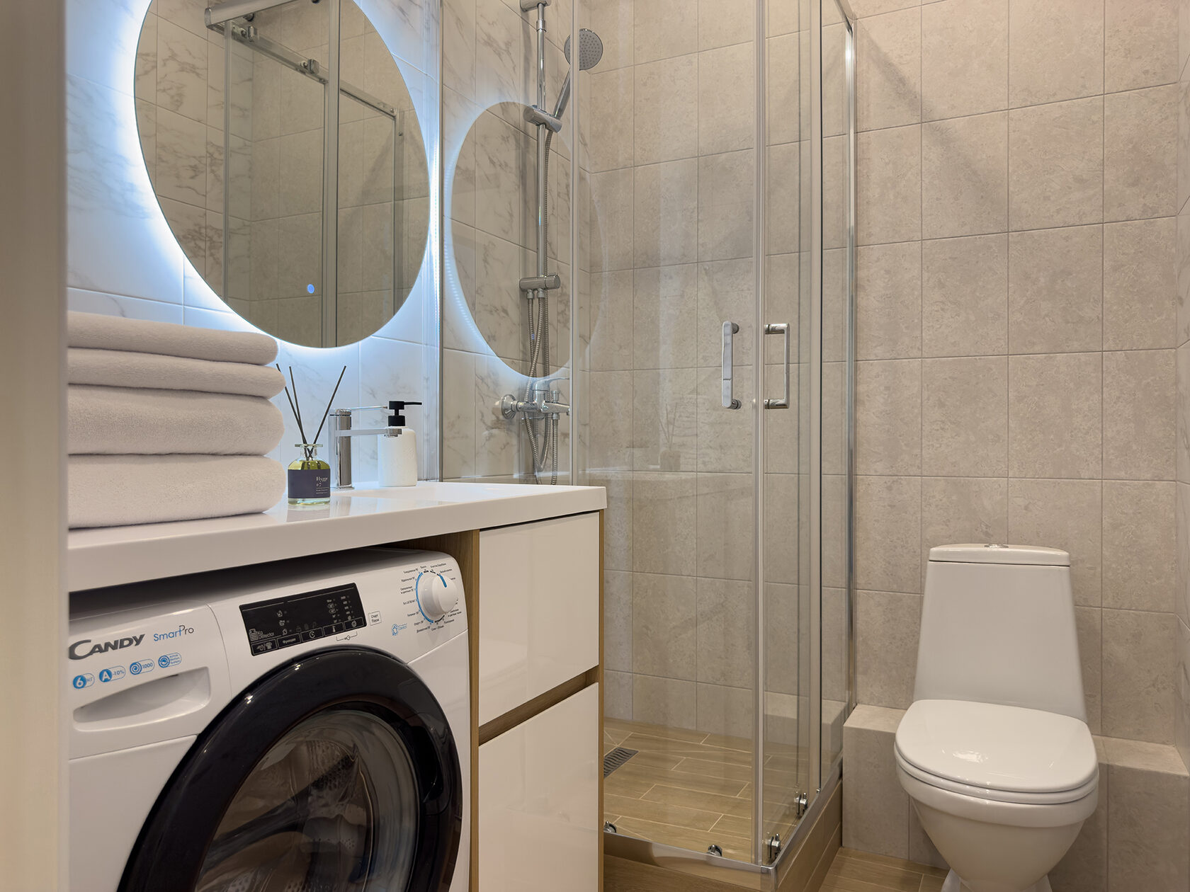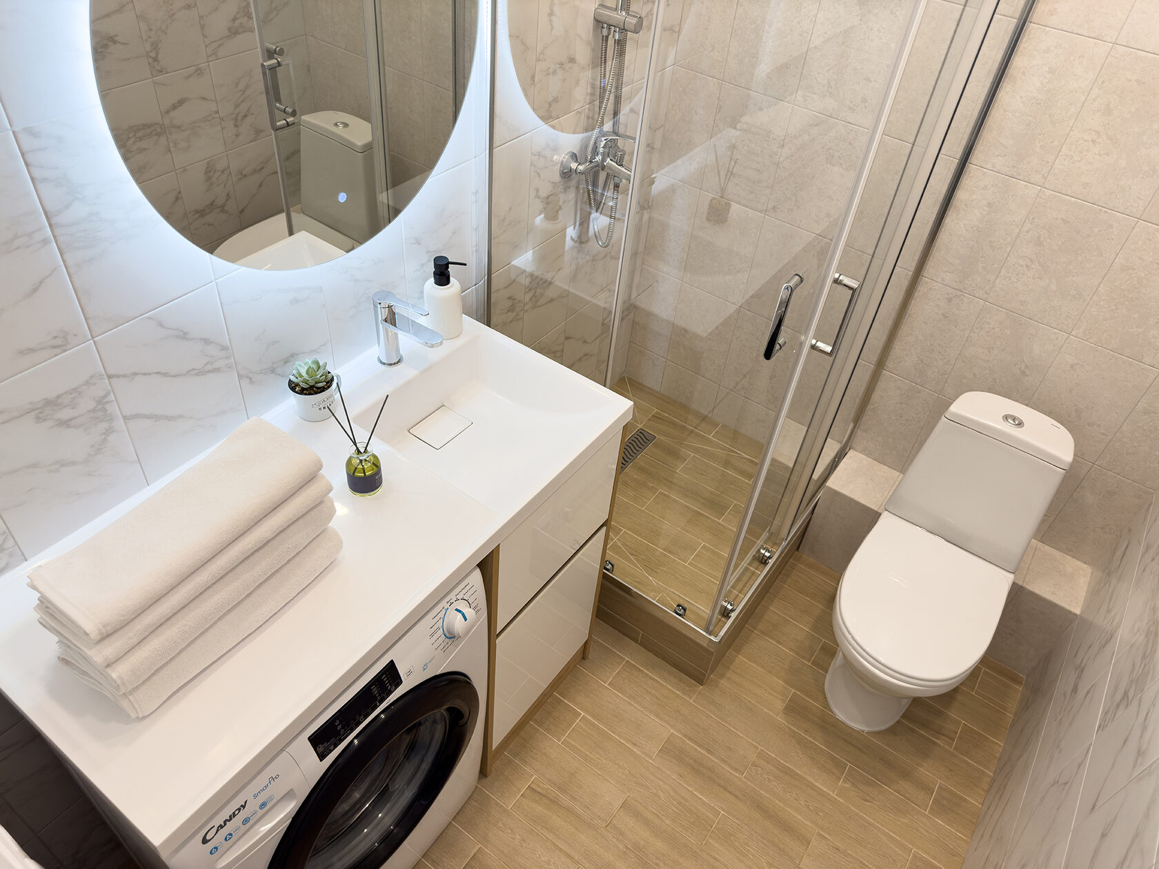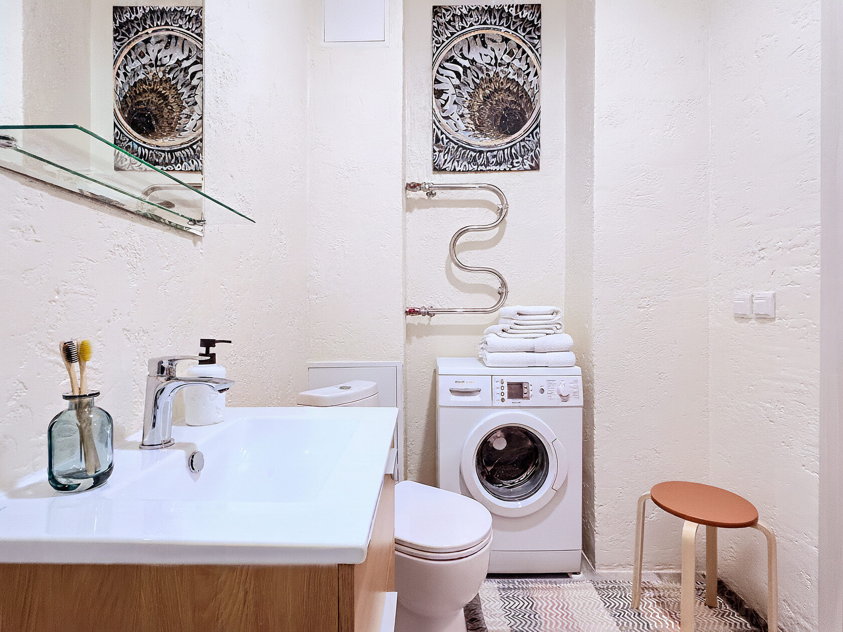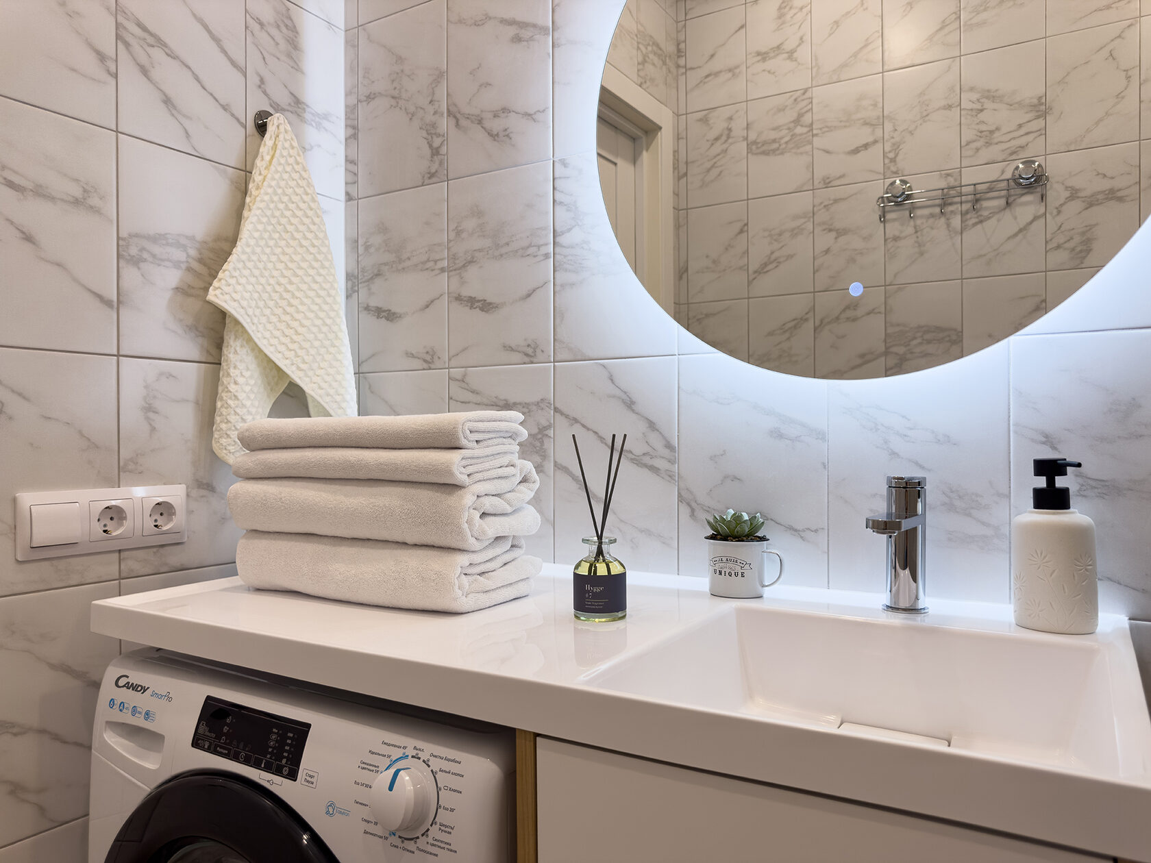 В квартире есть: Двуспальная кровать с ортопедическим матрасом (160х200) Раскладной диван Кондиционер Кухня со всем необходимым (посудомоечная машина, холодильник, варочная панель, микроволновая печь, чайник, а так же посуда, приборы и фильтр для питьевой воды) Стиральная машина, фен, утюг, гладильная доска, сушилка для одежды Smart tv (онлайн-кинотеатры, youtube) и высокоскоростной wi-fi Шкаф Шампунь, гель для душа, жидкое мыло, ватные палочки, ватные диски, стиральный порошок Чай, кофе, сахар, соль На каждого гостя предусмотрено по 2 полотенца. Замена белья и полотенец производится при бронировании свыше 7 суток бесплатно. В иных случаях за дополнительную плату.