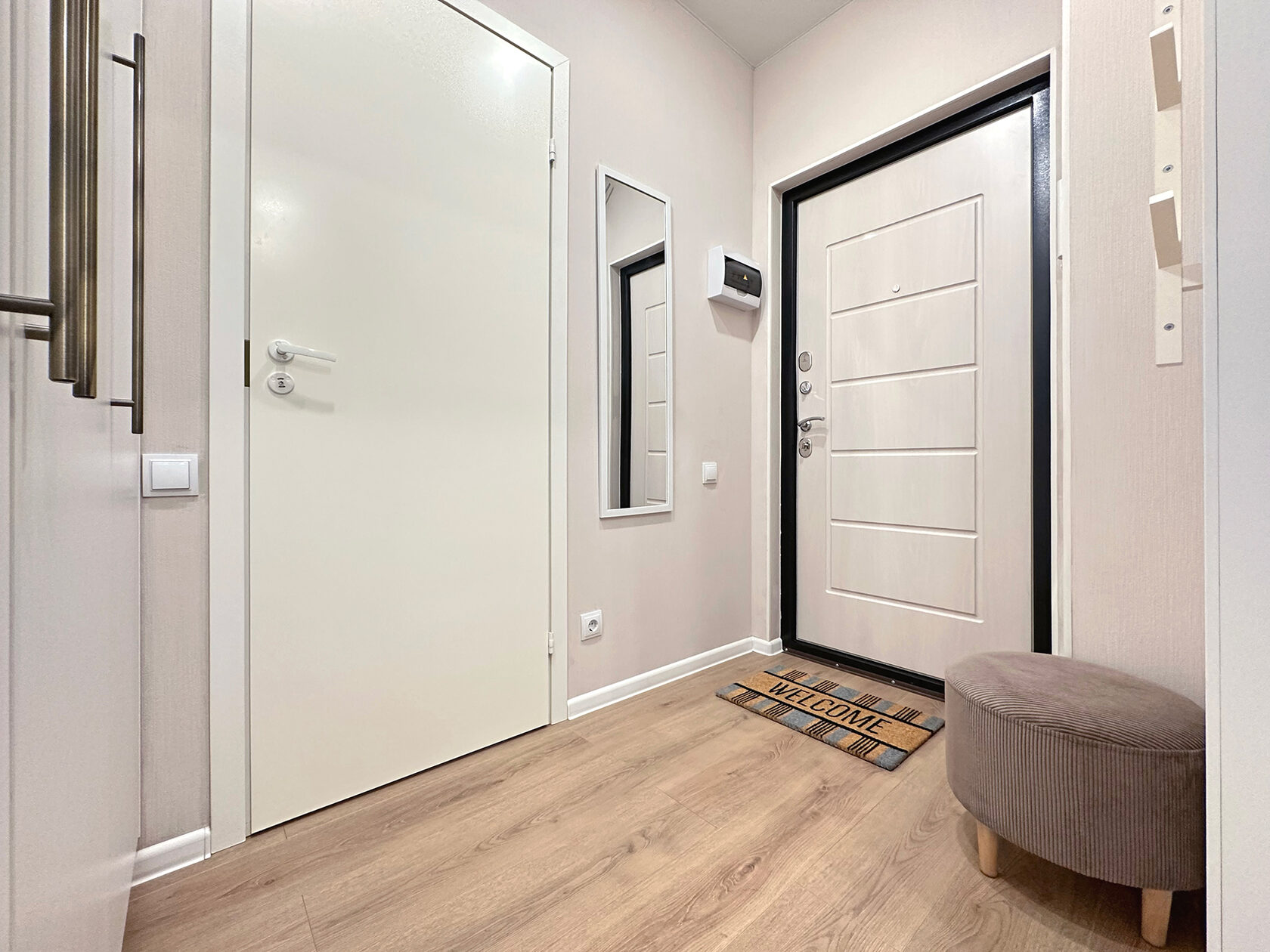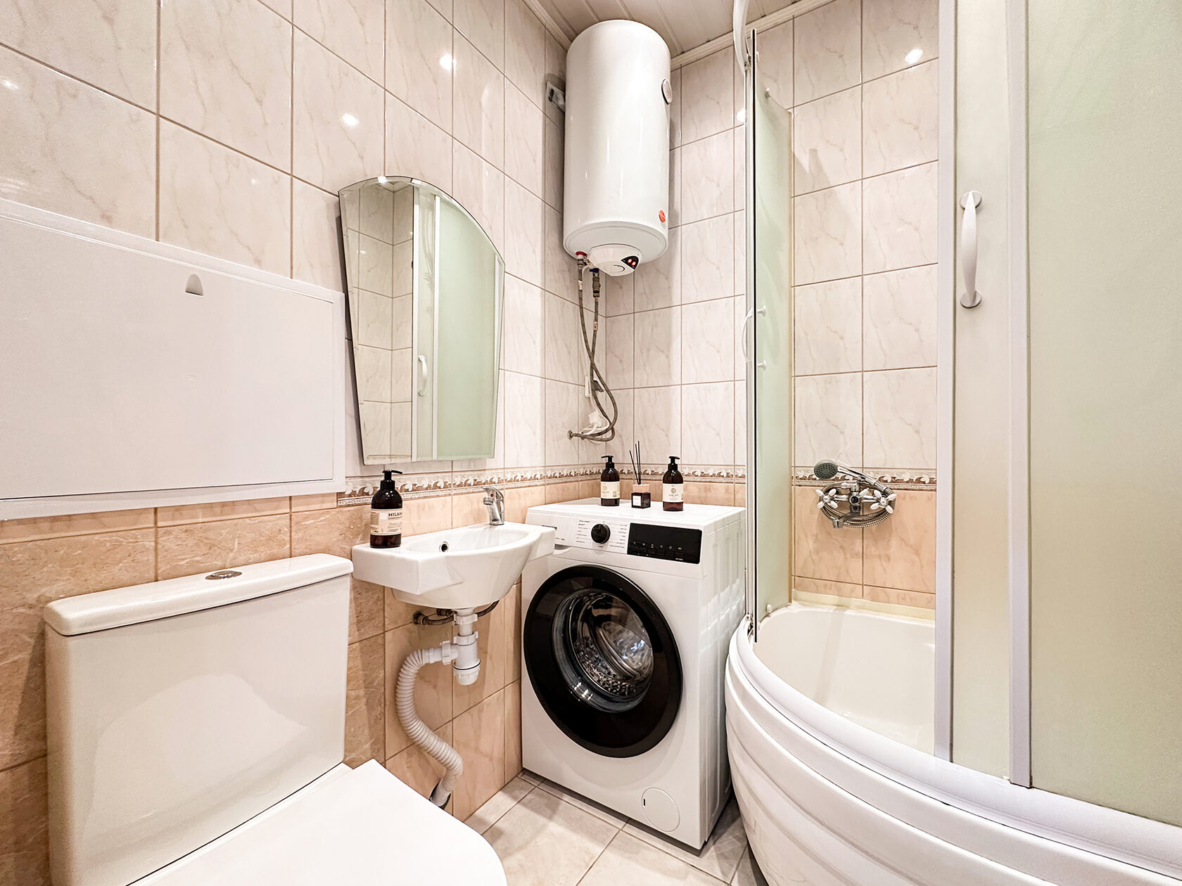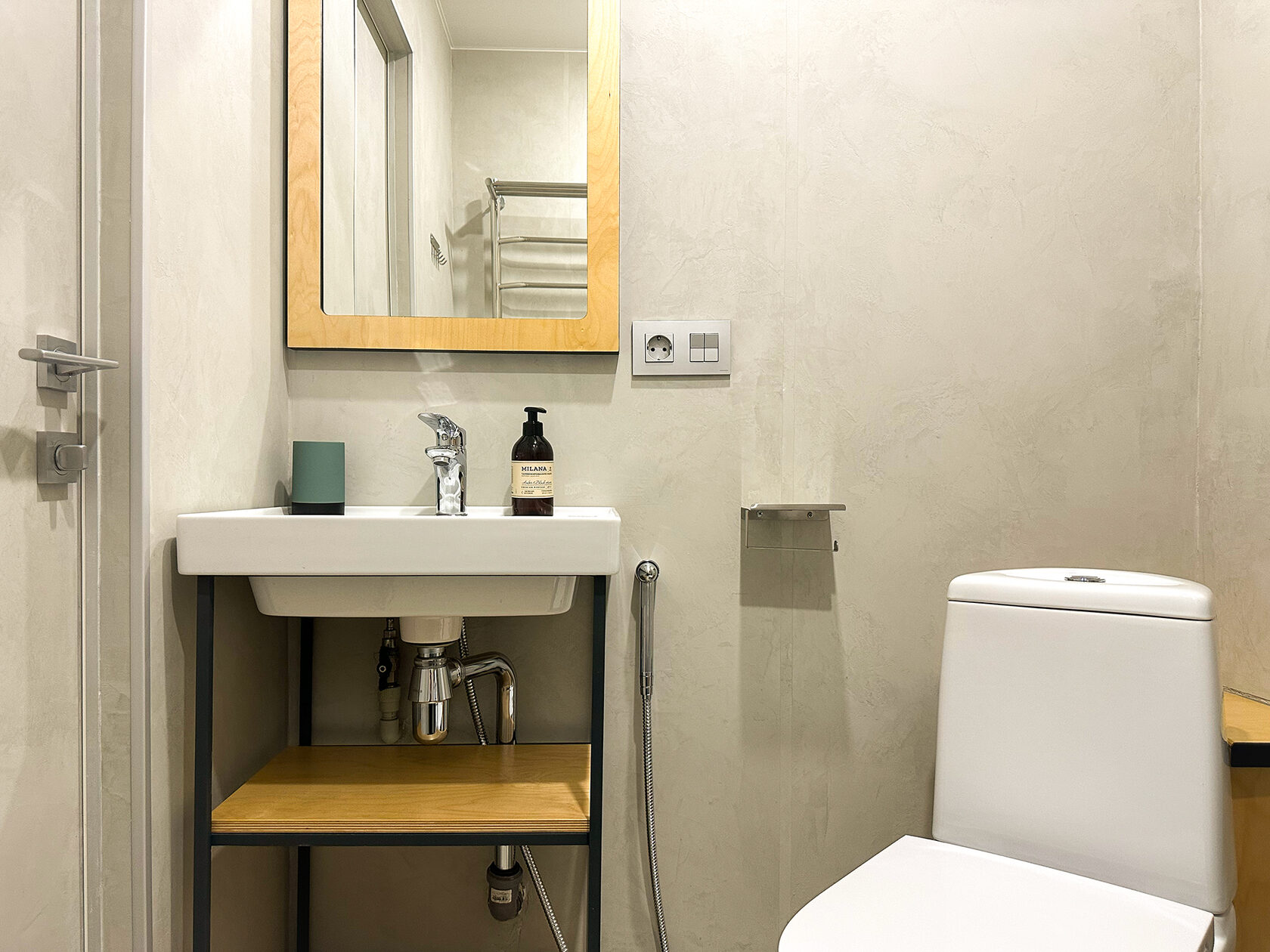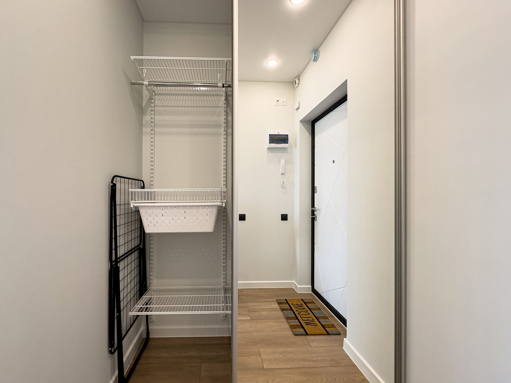 В квартире есть: Двуспальная кровать с ортопедическим матрасом (160х200) Раскладной диван Кондиционер Кухня со всем необходимым (посудомоечная машина, холодильник, варочная панель, микроволновая печь, чайник, а так же посуда, приборы и фильтр для питьевой воды) Стиральная машина, фен, утюг, гладильная доска, сушилка для одежды Smart tv (онлайн-кинотеатры, youtube) и высокоскоростной wi-fi Шкаф Шампунь, гель для душа, жидкое мыло, ватные палочки, ватные диски, стиральный порошок Чай, кофе, сахар, соль На каждого гостя предусмотрено по 2 полотенца. Замена белья и полотенец производится при бронировании свыше 7 суток бесплатно. В иных случаях за дополнительную плату.
