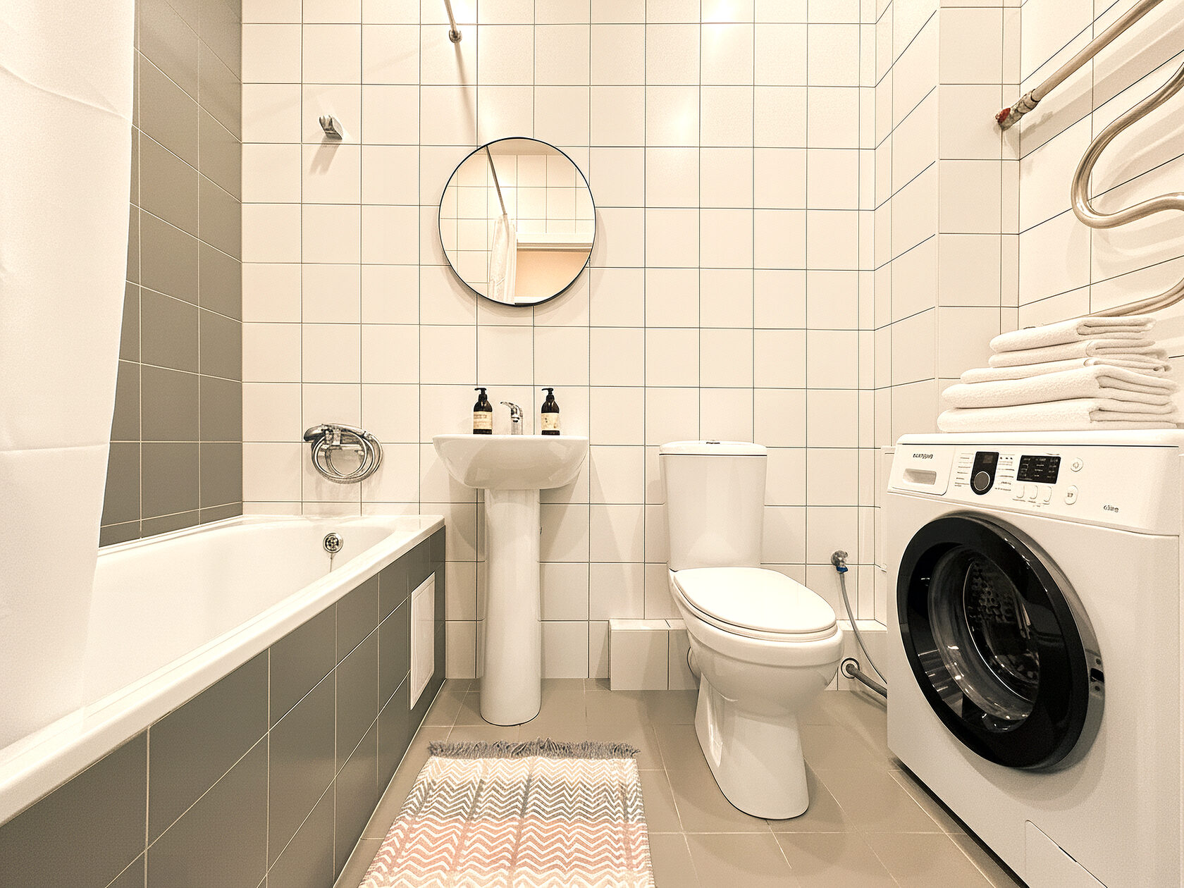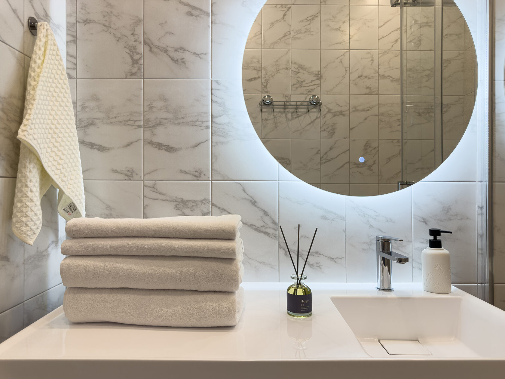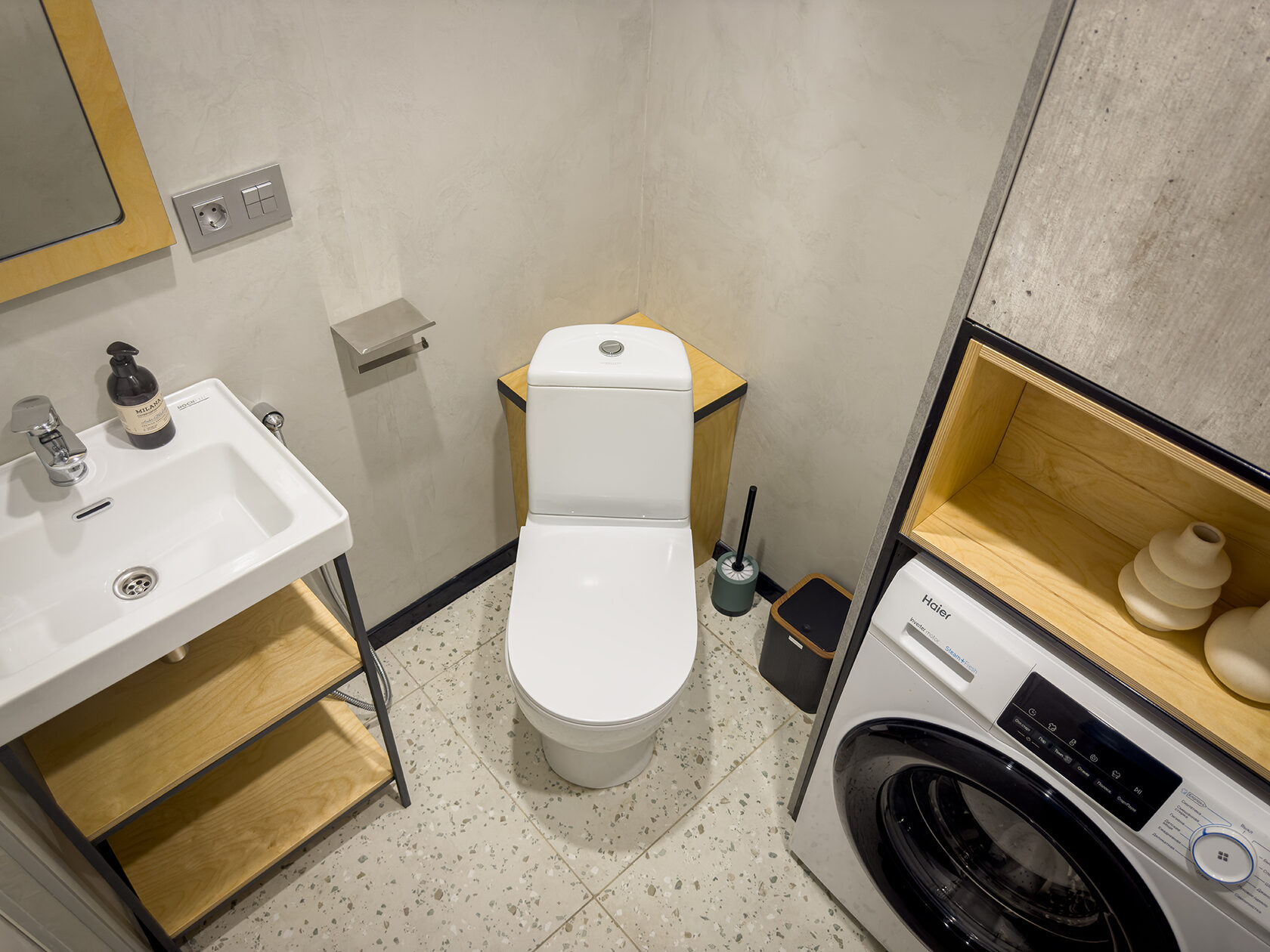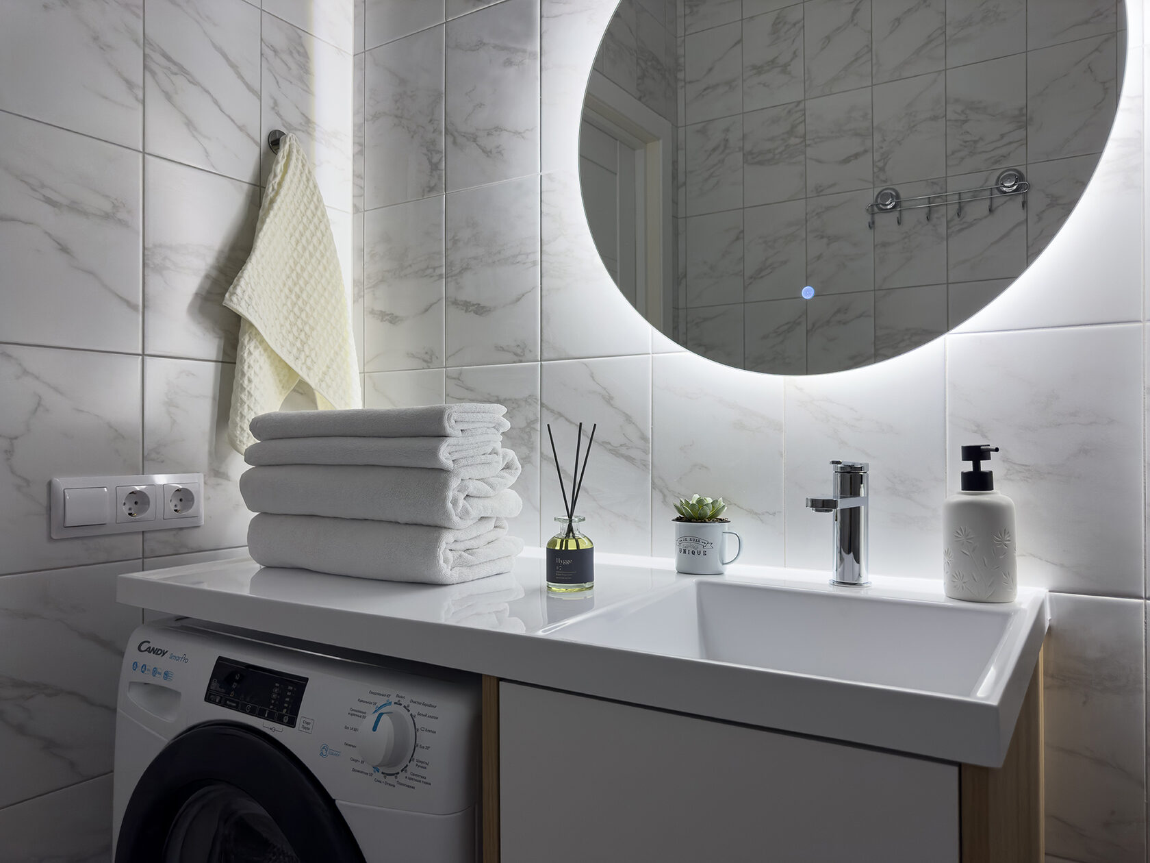 В квартире есть: Двуспальная кровать с ортопедическим матрасом (160х200) Раскладной диван Кондиционер Кухня со всем необходимым (посудомоечная машина, холодильник, варочная панель, микроволновая печь, чайник, а так же посуда, приборы и фильтр для питьевой воды) Стиральная машина, фен, утюг, гладильная доска, сушилка для одежды Smart tv (онлайн-кинотеатры, youtube) и высокоскоростной wi-fi Шкаф Шампунь, гель для душа, жидкое мыло, ватные палочки, ватные диски, стиральный порошок Чай, кофе, сахар, соль На каждого гостя предусмотрено по 2 полотенца. Замена белья и полотенец производится при бронировании свыше 7 суток бесплатно. В иных случаях за дополнительную плату.