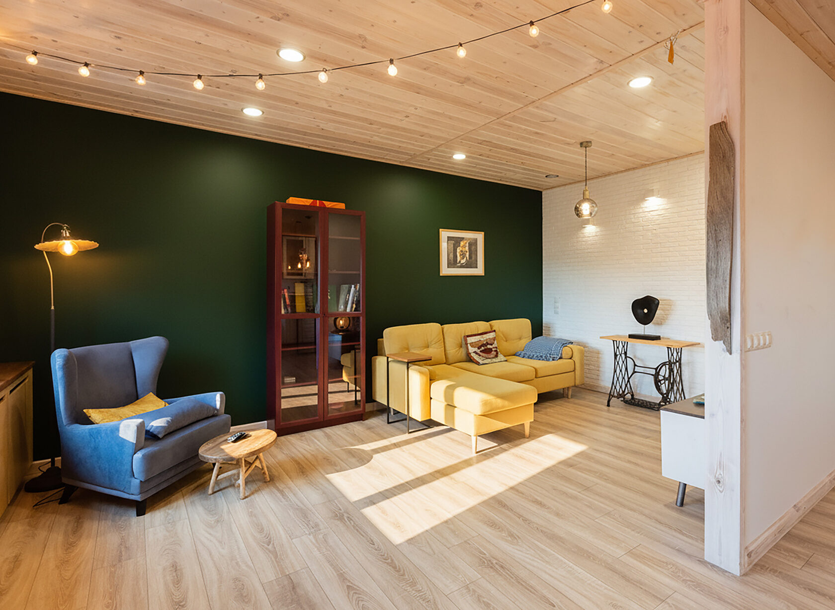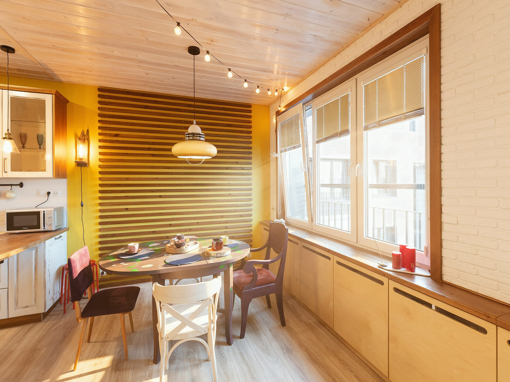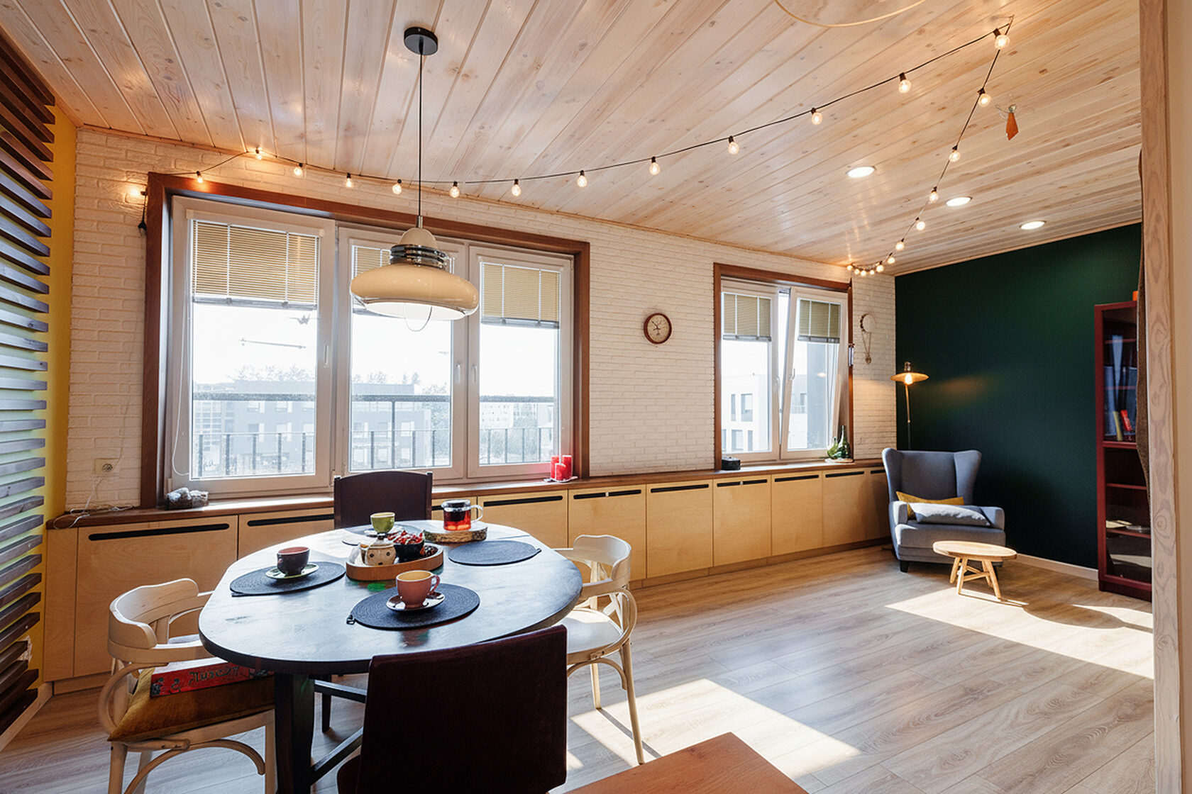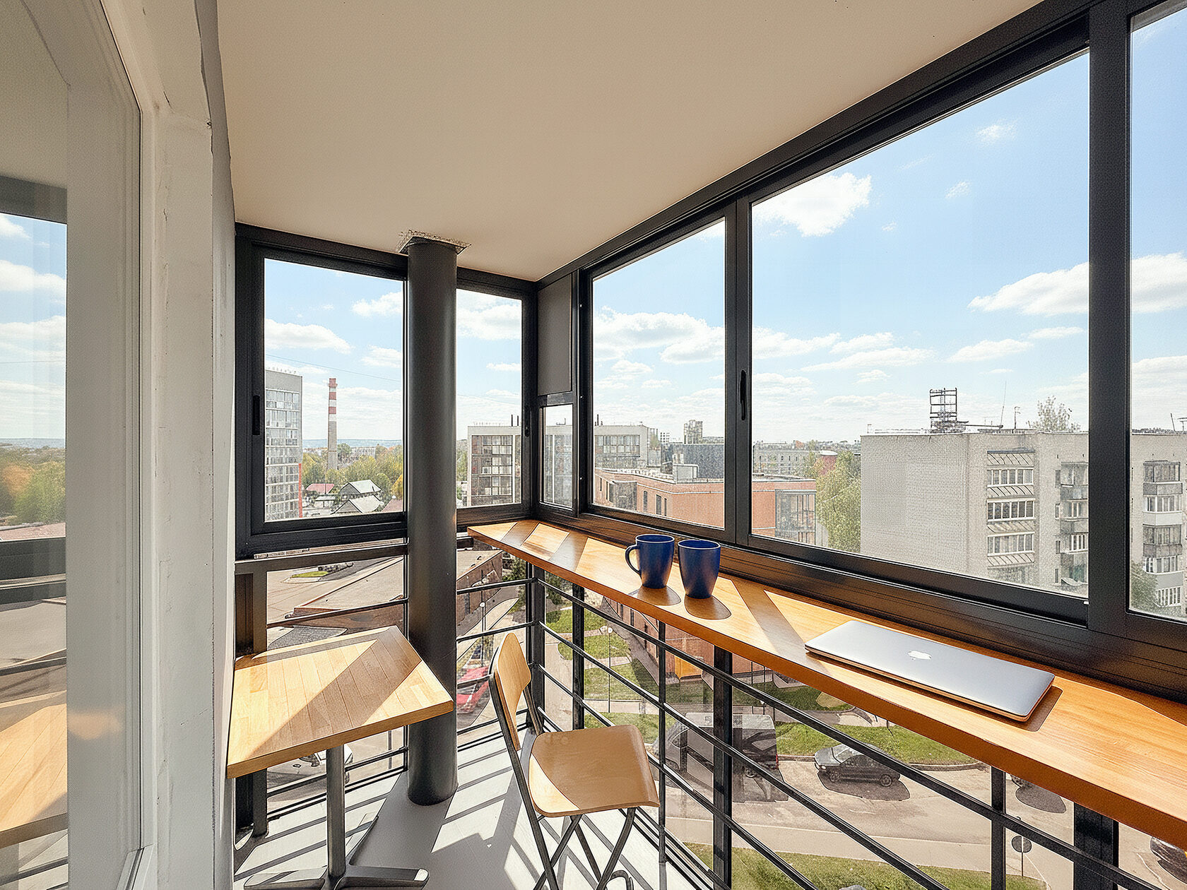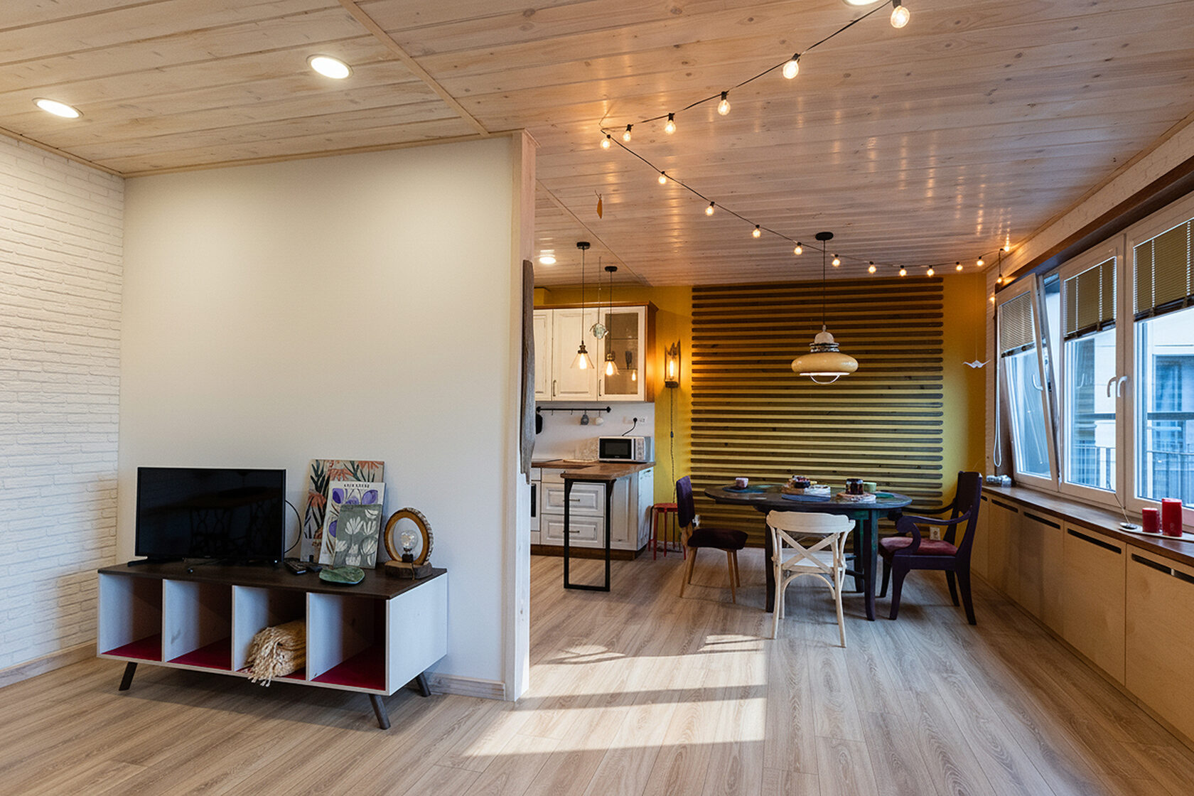 Сеть дизайнерских квартир «Карельский Лось" предлагает уютную дизайн квартиру-студию. Приятный вид с балкона, декор из бересты и дерева ручной работы. На стенах холсты с авторской каллиграфией. В апартаментах с удобством могут разместится до 5 человек: